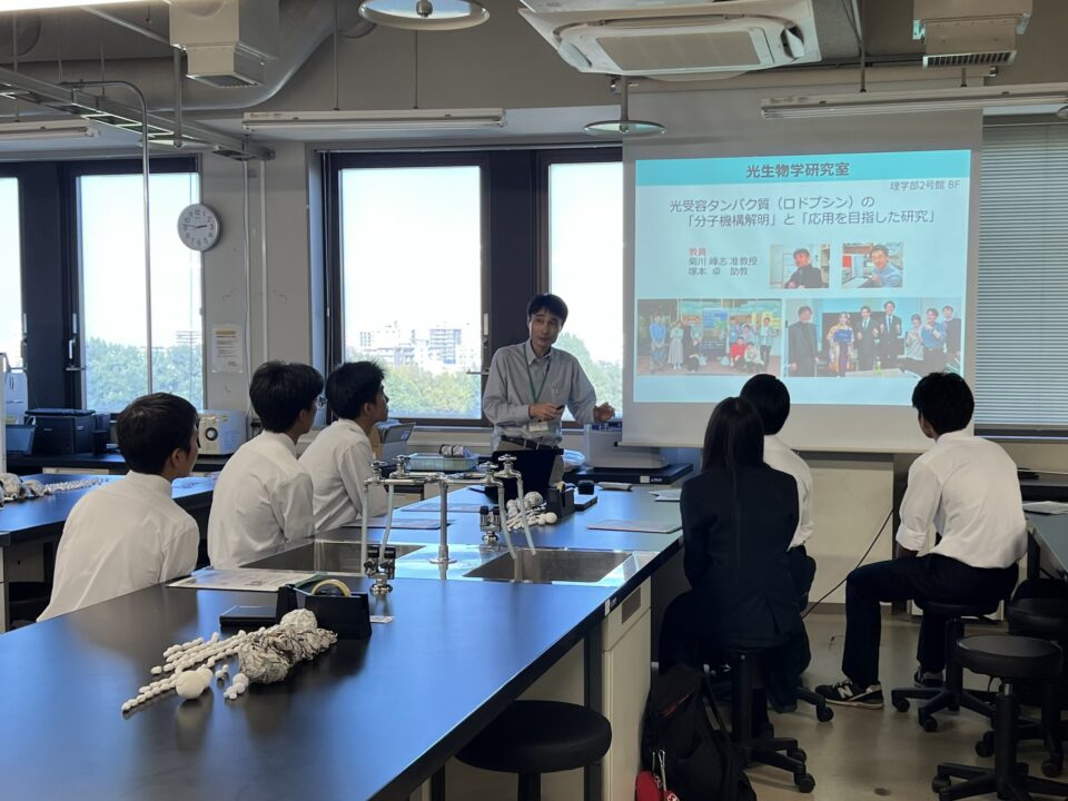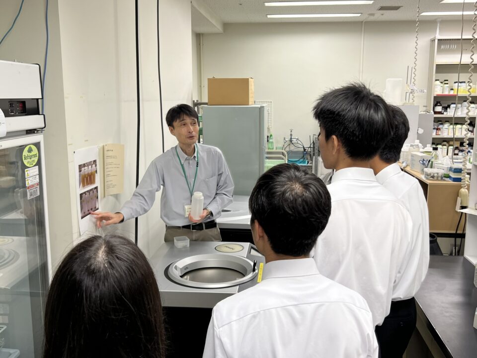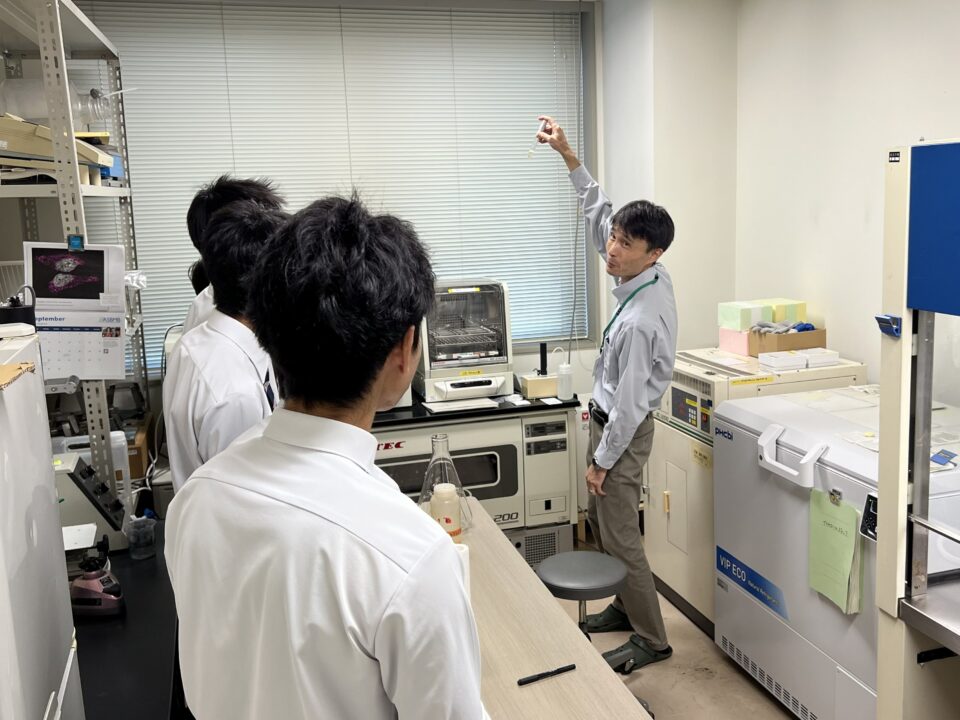 研究室内では、学生が実験を行っている様子や、タンパク質の測定装置が動くところを見学しました。高校生たちは熱心に話を聞いており、積極的に質問する姿も見られました。