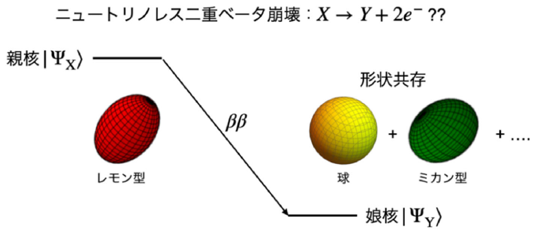 ニュートリノレス二重ベータ崩壊の親核またはその娘核の基底状態付近では、異なる形状が共存する場合があり、それが崩壊の半減期の決定に重要な役割を持つことが本研究で明らかとなった。図の|ΨX>と|ΨY>はそれぞれ親核、娘核の基底状態を表し、親核はレモン型形状を呈し、娘核では球形とミカン型形状の共存を模式的に示す。