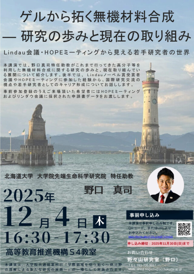 また後半では、Lindauノーベル賞受賞者会議およびHOPEミーティングへの参加経験から、国際研究交流や若手研究者のキャリア形成に関する視点についてもお話しします。