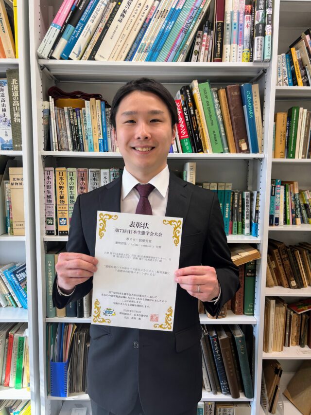 生態遺伝学系の内海研究室の古澤惇平さん(博士後期課程)、野村康太さん(修士課程)が、京都市にて開催された第73回日本生態学会大会(参加者総数3,272名)で「ポスター発表優秀賞」を受賞しました。古澤さんはゴミムシを、野村さんはオオバコなどさまざまな植物種を対象に、人新世において私たちの目の前で生じている驚くべき形質の変化について発見し、さらにそのメカニズムを明らかにする研究に取り組んでいます。本大会では、それらの研究成果の一部を発表し、高い評価を受けました。