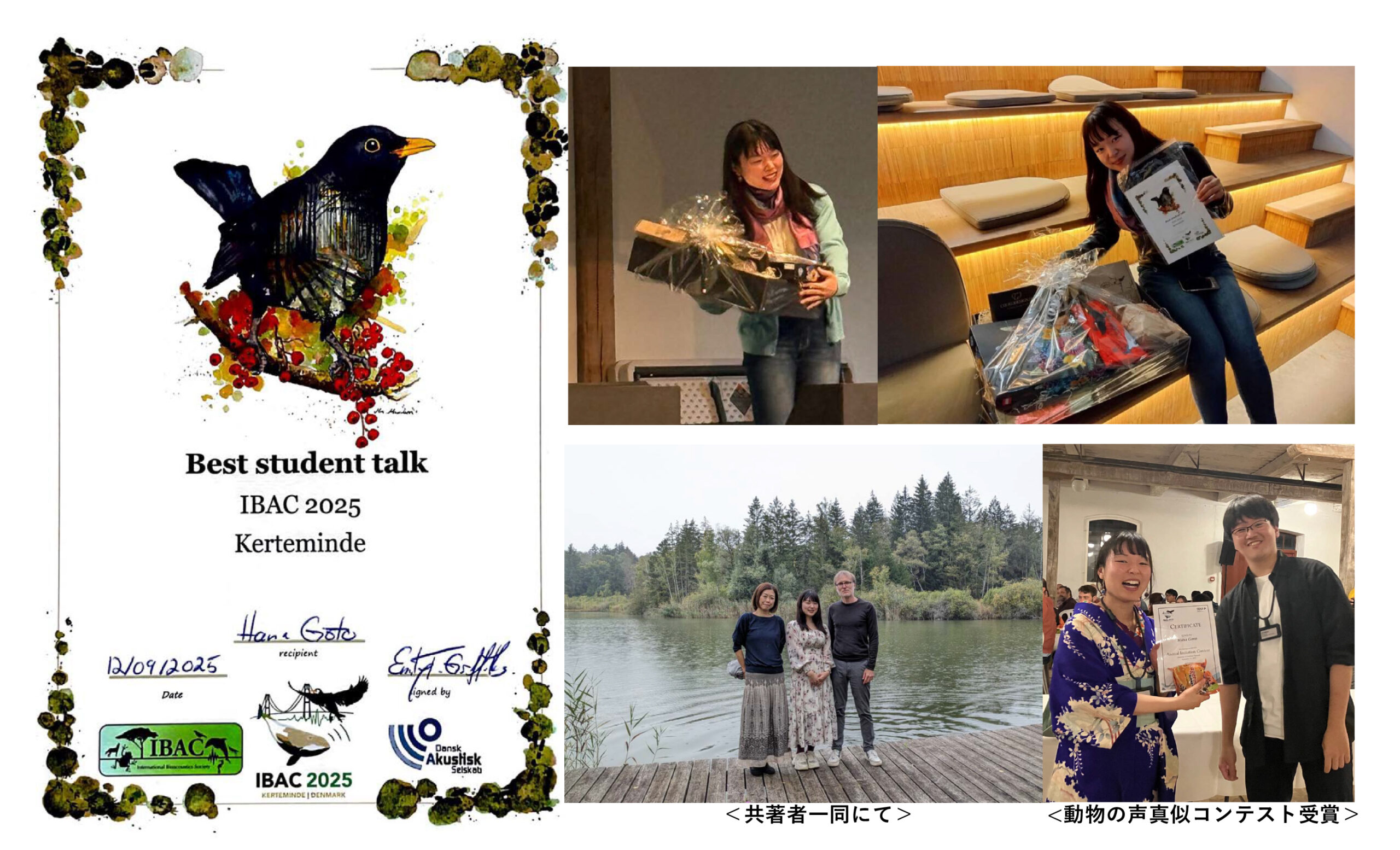 相馬研究室(行動神経生物学)の五藤花さん(博士後期課程 2 年)が、国際生物音響学会(IBAC: International Bioacoustics Congress)にて、最優秀口頭発表賞を受賞しました。おめでとうございます。
