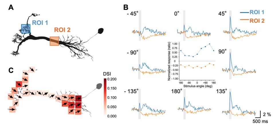 C. 細胞内の各領域におけるカルシウム反応の方向選択性。各ROIの色は選択性の強さを、矢印はチューニングカーブから算出した選好方向を示す。
