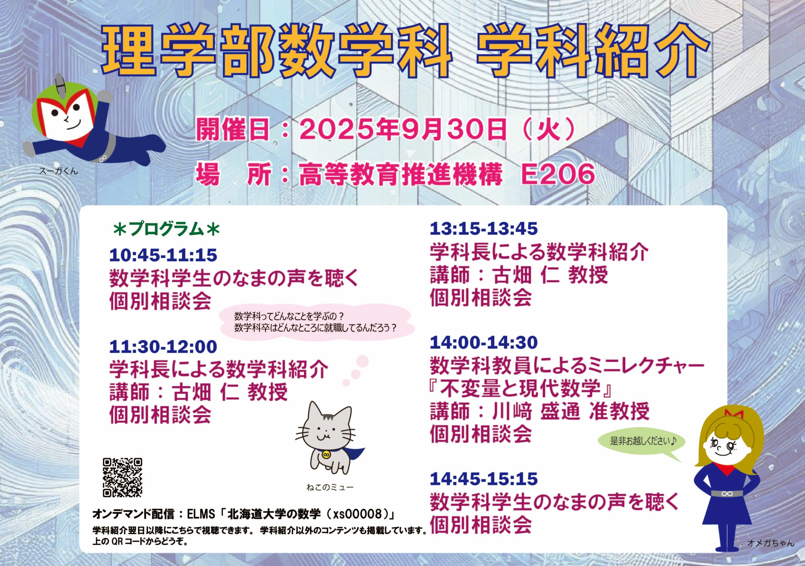 9月30日(火)に学部・学科紹介が行われます。数学科の企画は以下をご覧ください。