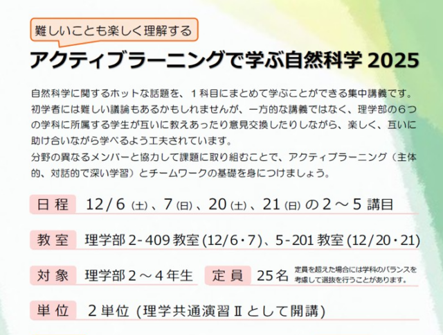 2025年12月6日-2025年12月21日開催中アクティブラーニングで学ぶ自然科学2025応募締切 2025年12月1日