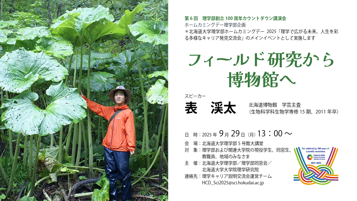 内 容:理学部の近況について報告するとともに、理学部OBの表 渓太氏による第6回理学部創立100周年カウントダウン講演会「フィールド研究から博物館へ」を開催します。