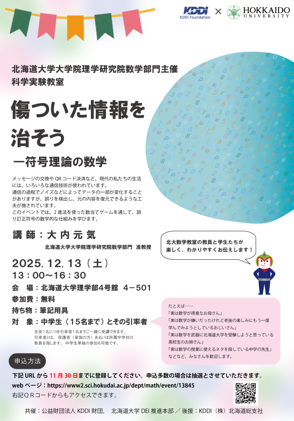 メッセージの交換やQRコード決済など、現代の私たちの生活には、いろいろな通信技術が使われています。通信の過程でノイズなどによってデータの一部が変化することがありますが、誤りを検出し、元の内容を復元できるような工夫が施されています。このイベントでは、2進法を使った数当てゲームを通して、誤り訂正符号の数学的な仕組みを学びます。