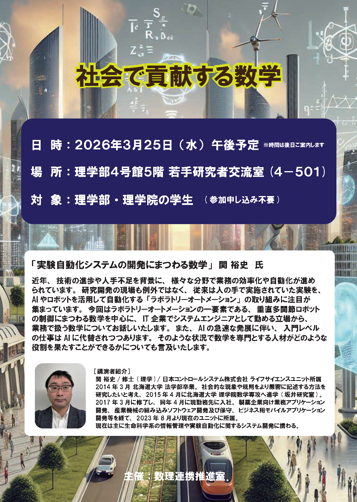 近年、技術の進歩や人手不足を背景に、様々な分野で業務の効率化や自動化が進められています。研究開発の現場も例外ではなく、従来は人の手で実施されていた実験を、AIやロボットを活用して自動化する「ラボラトリーオートメーション」の取り組みに注目が集まっています。今回はラボラトリーオートメーションの一要素である、垂直多関節ロボットの制御にまつわる数学を中心に、IT企業でシステムエンジニアとして勤める立場から、業務で扱う数学についてお話しいたします。また、AIの急速な発展に伴い、入門レベルの仕事はAIに代替されつつあります。そのような状況で数学を専門とする人材がどのような役割を果たすことができるかについても言及いたします。