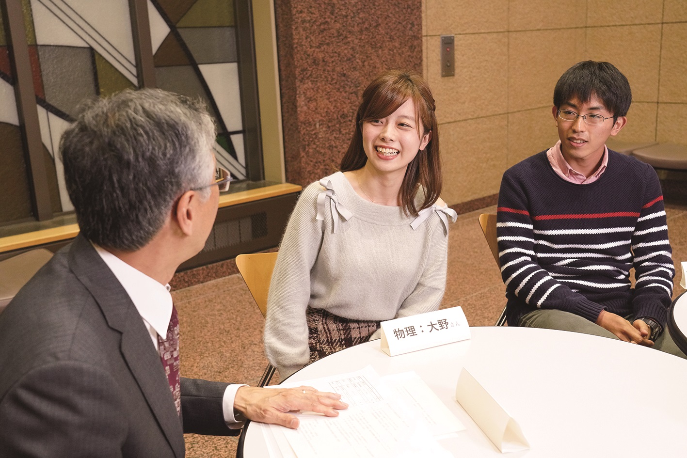 大野 1クラス30人くらいという少人数ですが、勉強だけではなく心の支えになってくれる友人が多くできました。物理学科に来てよかったと思っています。